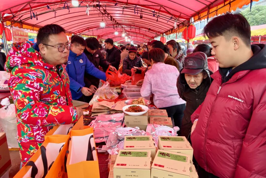 移民街洋溢着浓厚的节日气氛。一个个红棚摊位整齐排列,从本地新鲜的蔬菜水果、粮油米面,到手工制作的糍粑、麦芽糖、油炸粑粑,再到各类精品百货、非遗手工艺品,琳琅满目的年货吸引了不少居民驻足选购。“东西又多又实惠,不用到处跑,一次性就把年货备齐了!”提着满满购物袋的李阿姨笑着说道。