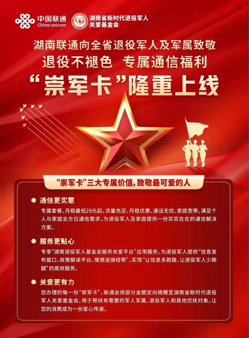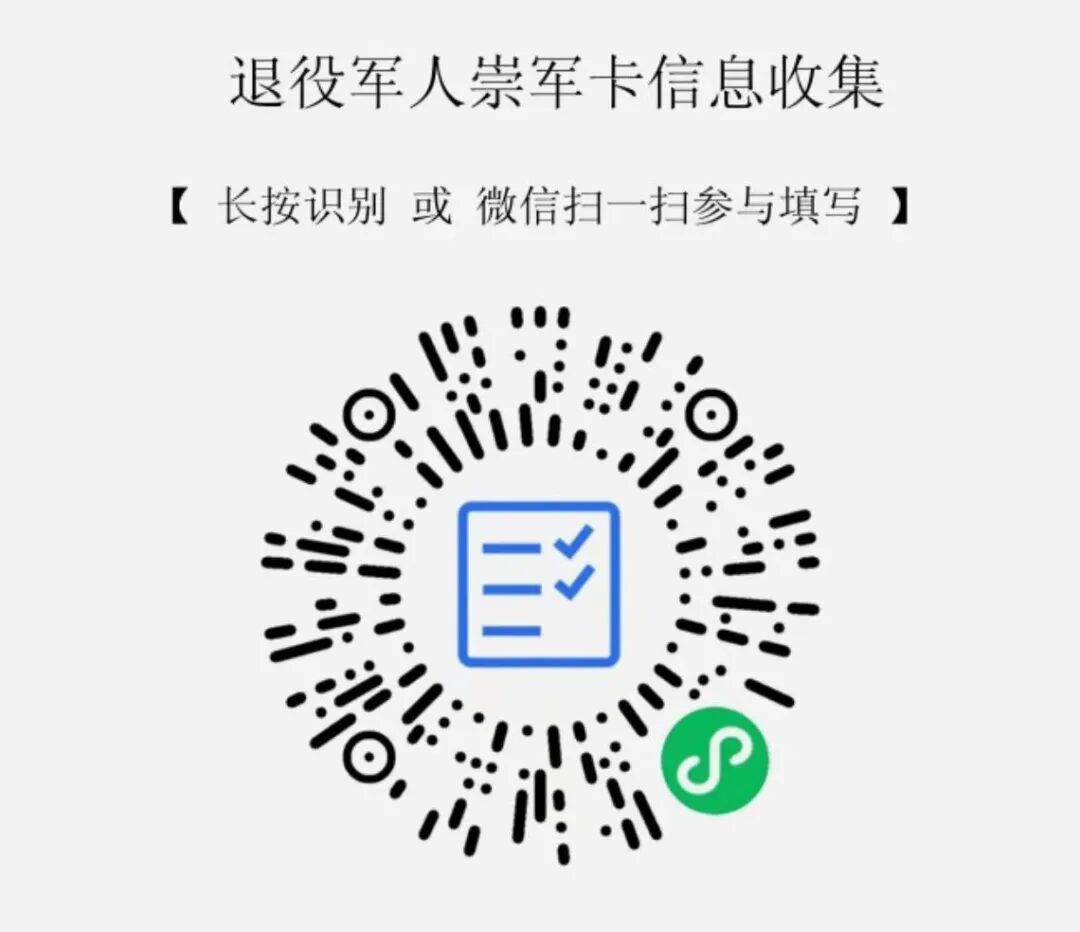 目前,“崇军卡”已正式上线,卡内含100元话费。退役军人及军属可通过线上扫码填报信息,免费申领并邮寄激活;线上填报截止时间为2月28日,号卡将于3月统一邮寄。线下办理开通后,也可前往联通营业厅或零陵区退役军人事务局指定服务点咨询办理。