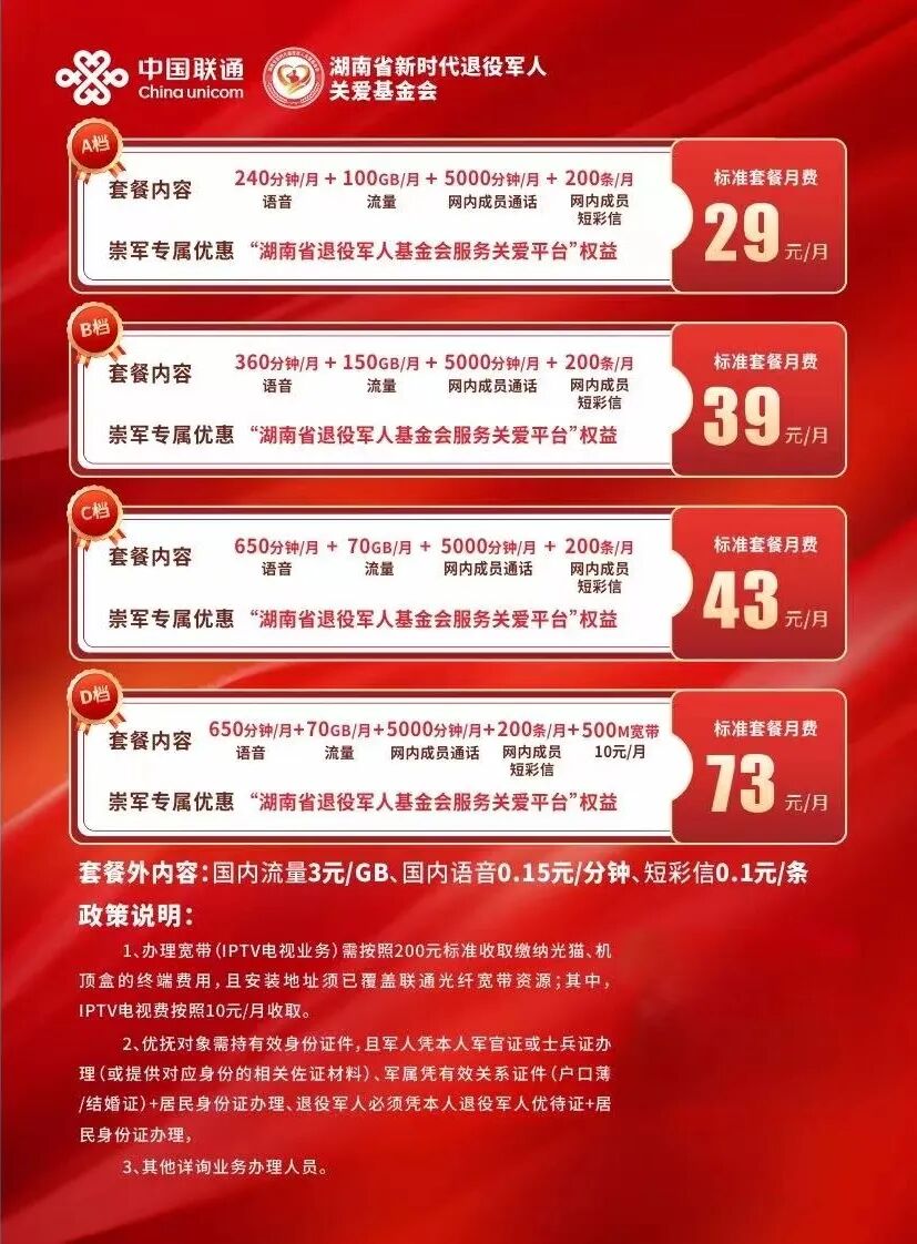 “崇军卡”主打通信实惠、服务贴心、关爱有力三大特色,提供四档高性价比套餐:29元/月含240分钟通话、100GB通用流量、5500分钟亲情网通话;39元/月在29元套餐基础上,通用流量提升至150GB;43元/月含650分钟通话、70GB通用流量、5500分钟亲情网通话;73元/月含650分钟通话、70GB通用流量、5000分钟亲情网通话及500M宽带。套餐外资费标准清晰:国内流量3元/GB、国内通话0.15元/分钟、短彩信0.1元/条。