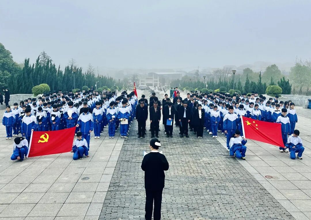 活动中,校领导深情讲述本地革命先烈的英雄事迹,将红色历史转化为生动教材,带领师生重温烽火连天的峥嵘岁月。“我们不会忘记,今天的美好生活是先烈用鲜血换来的……”学生代表以集体朗诵与发言的形式,表达铭记历史、奋发图强、报效祖国的坚定决心。随后,全体教师面向党旗重温入党誓词,全体学生面向国旗庄严宣誓。活动最后,师生有序绕行烈士纪念碑,敬献亲手制作的白花,瞻仰烈士墓碑。整个过程,全体人员全程肃立,以最朴素的方式表达对英烈最深沉的敬意。