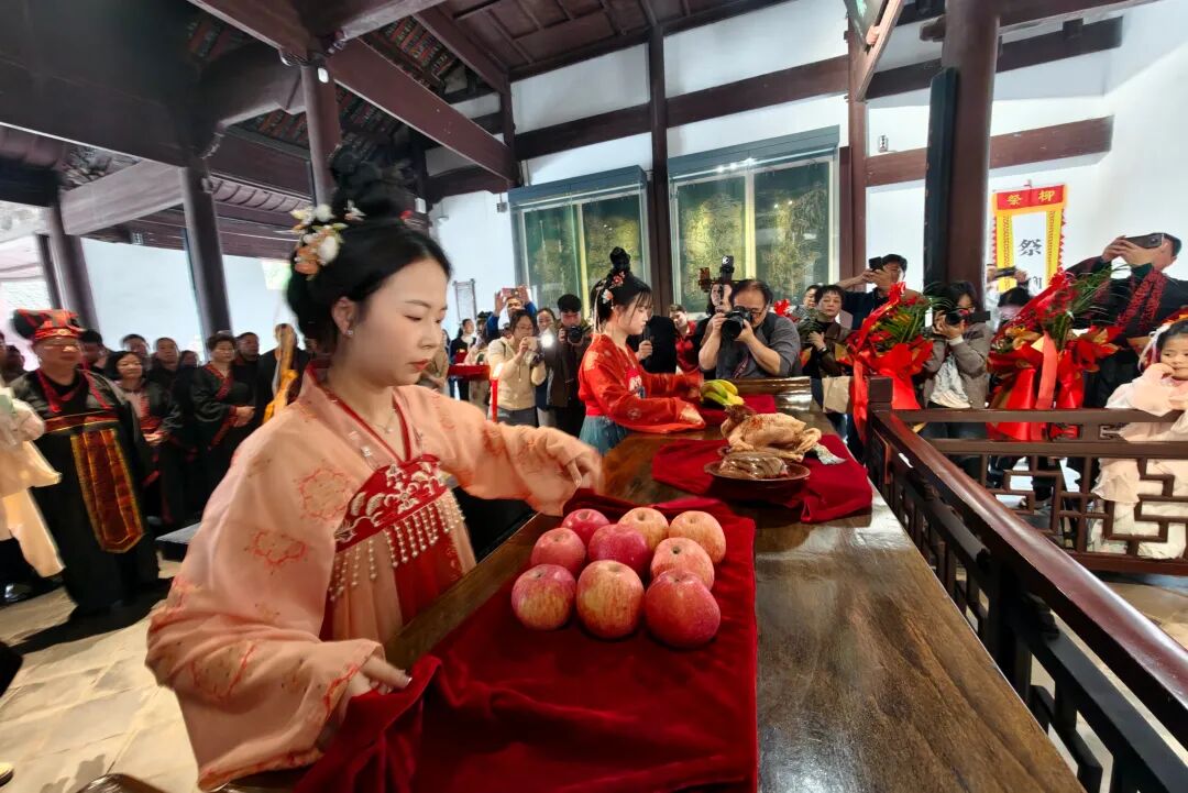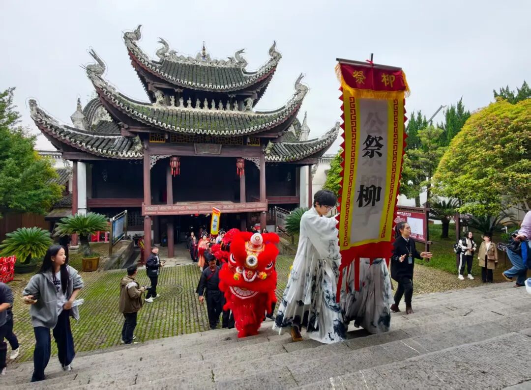 随后,巡城追思环节开始。祭祀队伍以公祭大旗、龙队乐鼓开道,沿中山路、柳子街等路线追寻柳宗元在永州的足迹。旌旗招展,鼓乐铿锵,重现千年文化盛景,引得沿途市民驻足瞻仰,共同追忆先贤风采。队伍抵达柳子庙后,庄重的庙堂祭祀仪式如期举行。擂鼓三通、敬献贡品、恭送花篮、上香奠酒、行鞠躬礼、恭读祭文、焚帛书、吟诵柳文等九项仪程依次进行。主祭、陪祭与全体参祭人员心怀虔敬,遵循古礼完成每一个环节,在古琴雅韵中寄托对柳宗元的深切缅怀与敬仰。