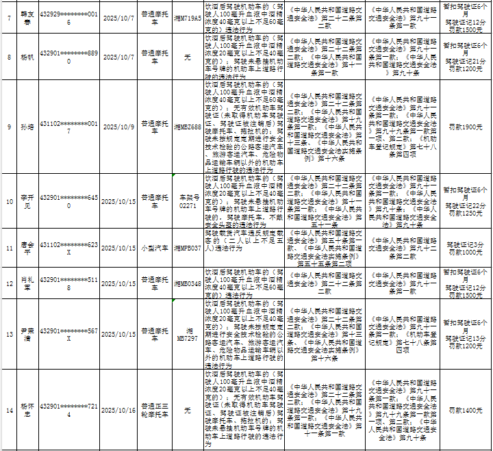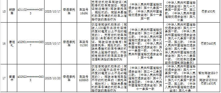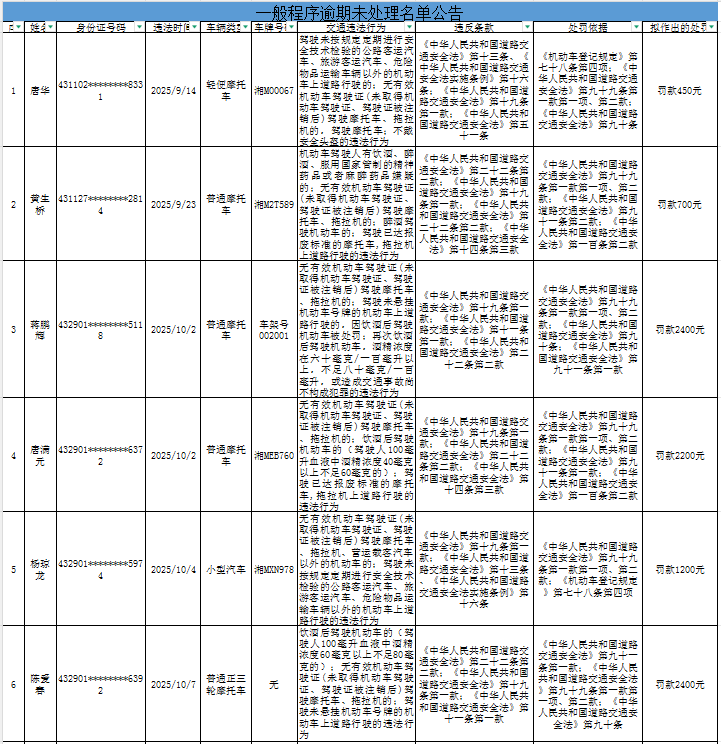 根据《中华人民共和国行政处罚法》《中华人民共和国道路交通安全法》及《湖南省实施〈中华人民共和国道路交通安全法〉办法》第四十六条等规定,唐华、黄生桥、蒋鹏辉等17名人员(具体名单详见附件)因道路交通安全违法行为,经本大队依法调查,已超过三十日逾期未接受处理。