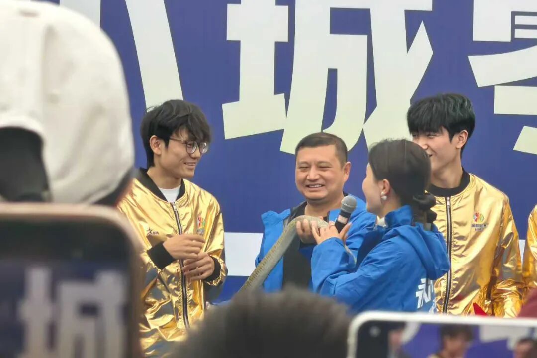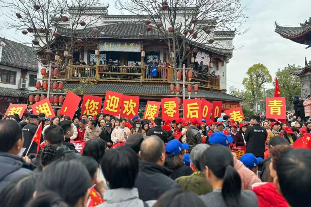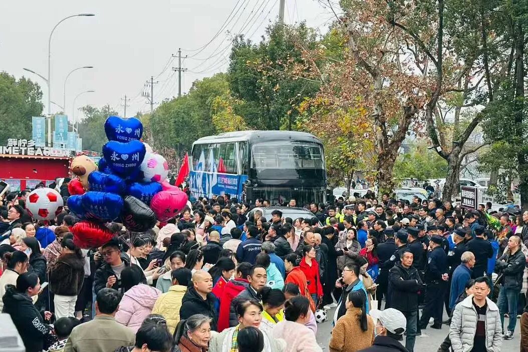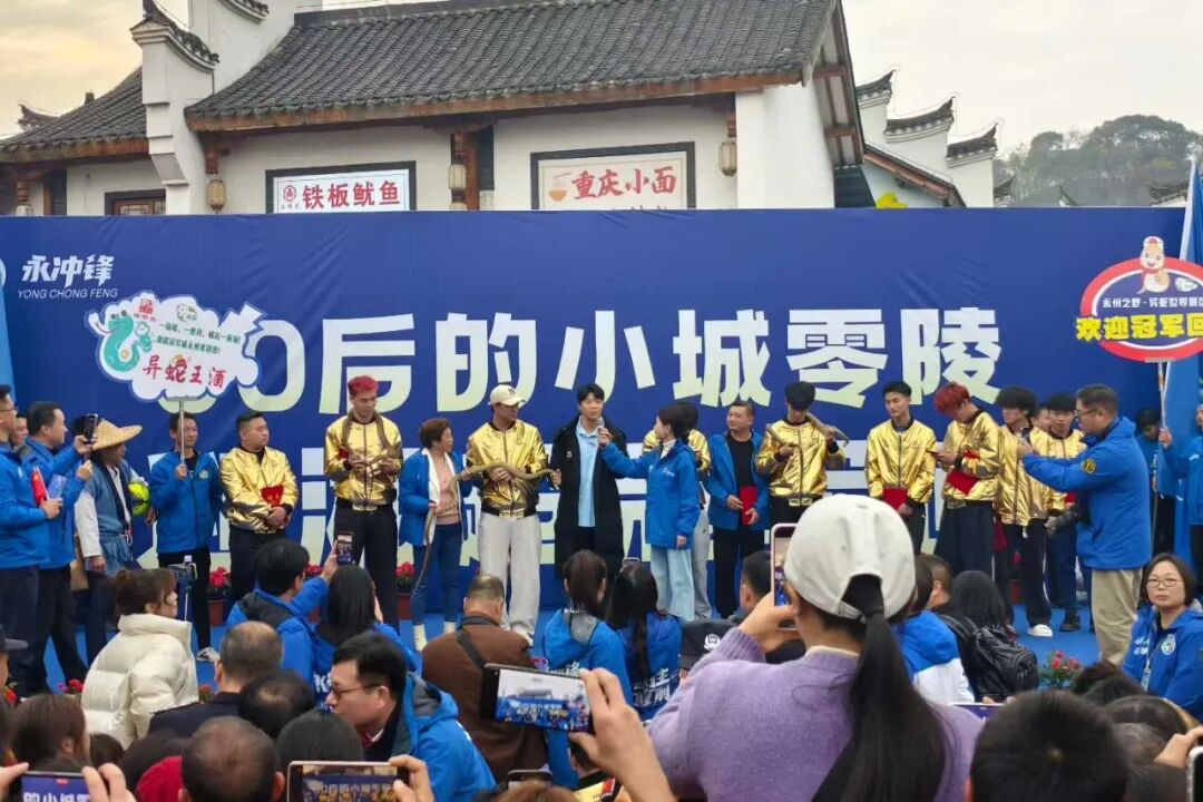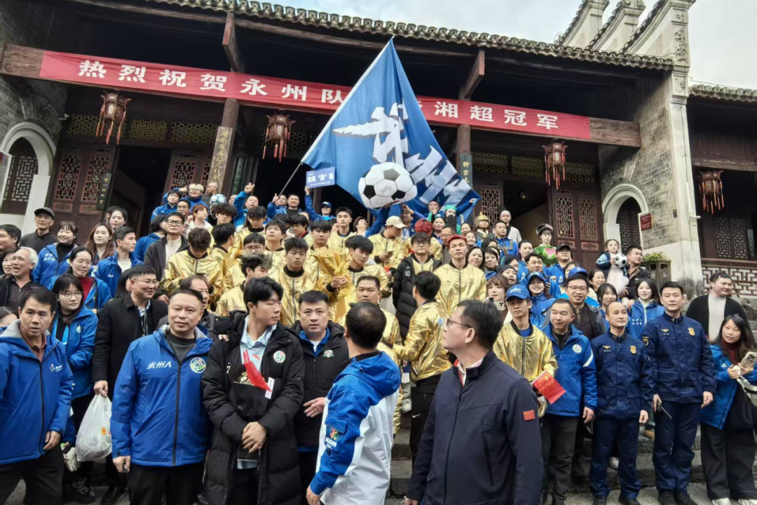 队伍行至零陵古城牌楼,迎接仪式进入最高潮。球迷方阵旌旗招摇,汉服方阵衣袂翩跹,零陵大鼓方阵鼓声震天,学生仪仗方阵花环舞动——四阵依次排开,击鼓声、呐喊声与歌声交织奔腾,汇成一片欢腾的海洋。在零陵古城瓦肆广场举行的球迷见面会上,球员与市民零距离互动,温情与激情相融。零陵文旅部门为谷文杰、林昊等队员正式颁发“零陵文旅推荐官”聘书,期待他们以冠军影响力助力家乡文旅传播。