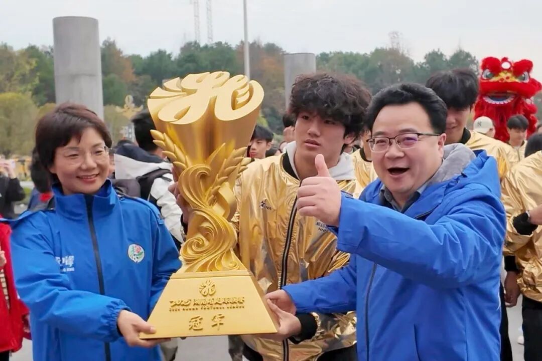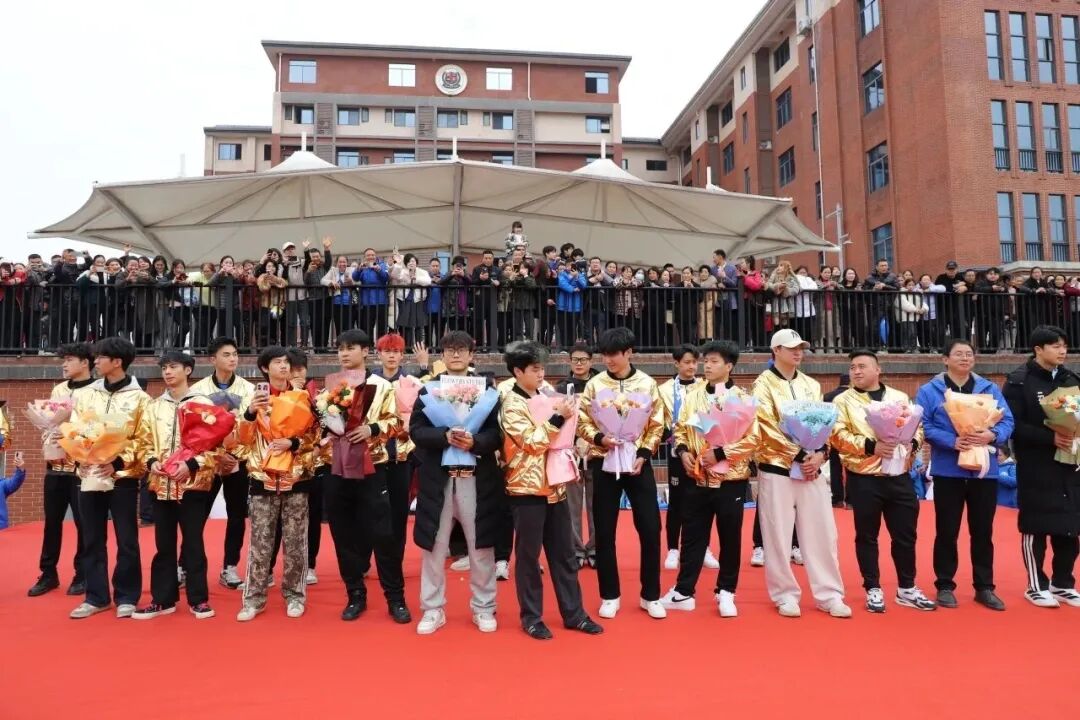 下午3时,永州队携冠军奖杯首站走进永州日升学校。校园内旌旗招展,横幅高悬,“湘超冠军校,日升欢迎您”的标语格外醒目。全校师生整齐列队,以热烈的掌声迎接心目中的偶像。球员高响动情分享夺冠历程,学子刘旺以队员身份感恩母校栽培,“冠军之队”与“育人名校”的精神在这一刻交融共鸣,激荡起澎湃的青春力量。