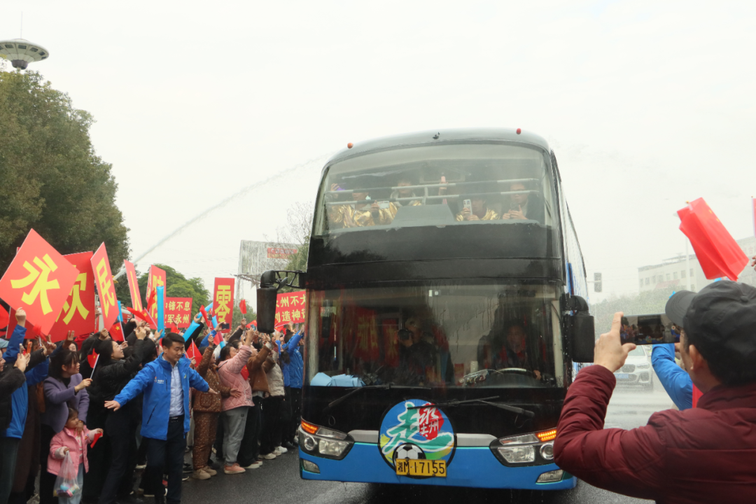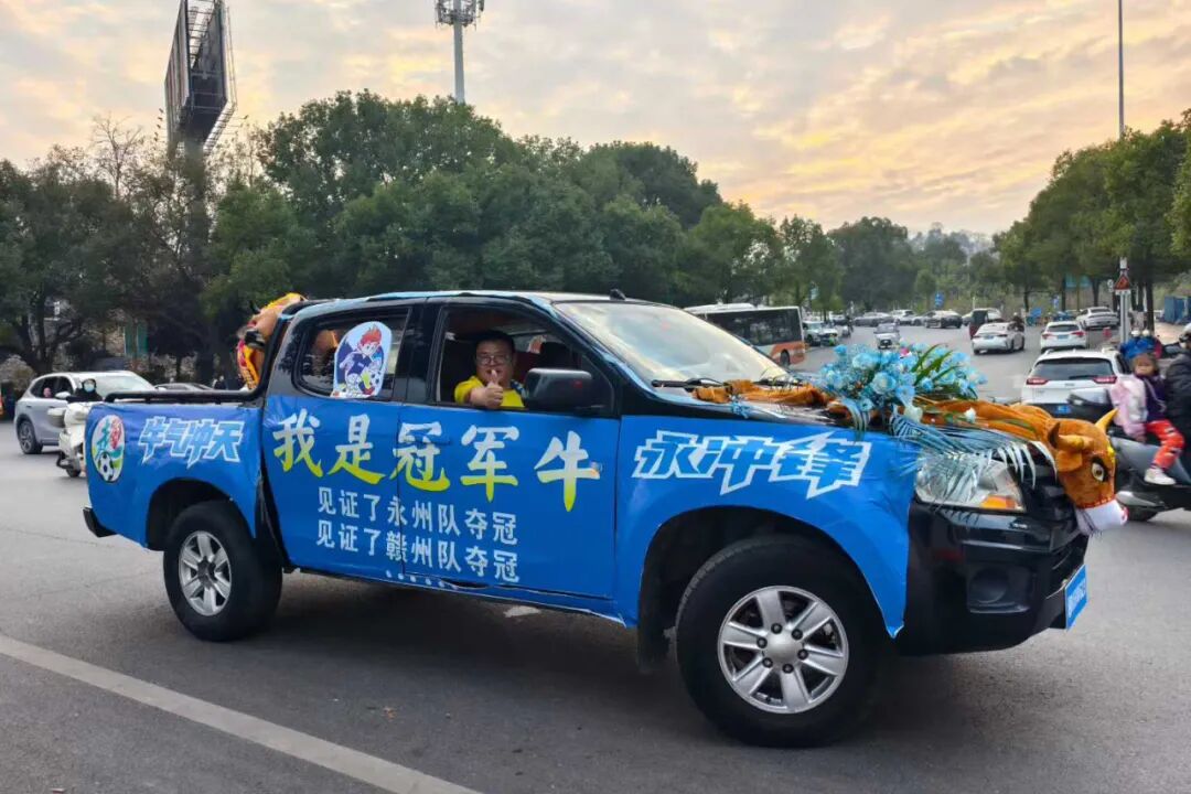 随后,冠军车队沿永州大道驶入零陵主城区。在南津北路入口,曾为球队慷慨捐赠六头牛的“牛扣哥”携牛引路,两辆消防车架起“水门”,以民航最高礼仪为英雄接风洗尘。水幕映衬“永州蓝”,沿途群众挥舞红旗、高举标语,欢呼声此起彼伏。在零陵区政府门前、零陵楼等地,市民自发穿上蓝色服装,形成一片蓝色海洋。
