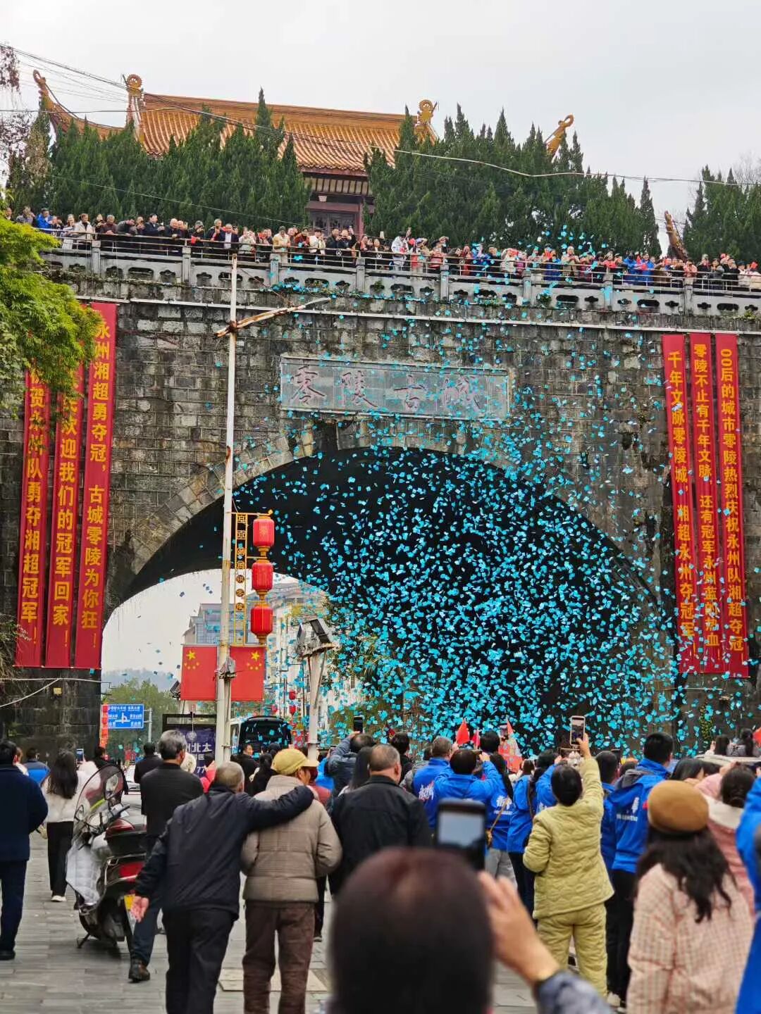 零陵楼上,志愿者撒下蓝色纸花,恰似一场“蓝色细雨”,为凯旋之路铺就浪漫风景。网友纷纷点赞:“过水门接风洗尘,过城门繁花似锦——此乃零陵独有的浪漫!”活动之中,文明亦成亮色。仪式结束后,志愿者与热心球迷迅速清理现场,不留纸屑,只留喝彩,以自觉行动诠释了庆祝与文明同行、激情与秩序共存的零陵风采。